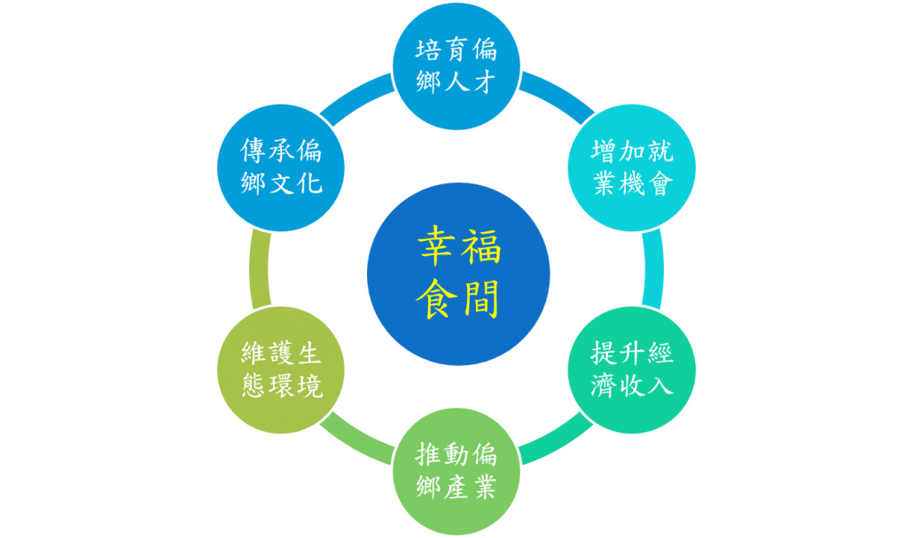 建構完整及良好的工作環境從農業、加工業、餐飲業、服務業、飯店業、觀光業以及偏鄉教育產業,讓從小接觸這些環境的小朋友關心家鄉和認識土地並找出適性的工作,留在家鄉打拼,永續發展偏鄉各項產業發展,真正達到青年留鄉的目標。